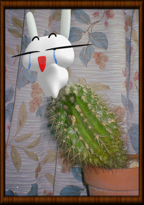 | みののちゃんから「うさうさ」の間違いを指摘されバージョン2に手直ししました、 初期バージョンとの違いがわかるかな〜 これまた家のサボテンくんに刺さっていた、うさうさの姿を激写した物です |
