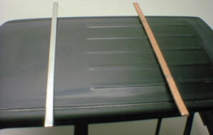 | 実はこれ、でっかいホッチキスの針みたいな金物で、よく八百屋にある野菜なんかが 入ったごついダンボール箱の底を止めてる金物を伸ばした物なんです。 丁度いい強度もあり、なんかキャリア上手く作れそうな予感がしてきました。 |