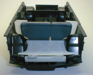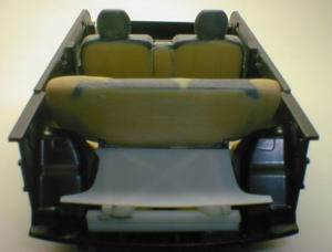 | 以上の点を手直ししつつ、このプラモのリアシートが実際のより横の幅が短いので 修正する事にします。実際はフロントシートより若干横幅は広いようです。 |