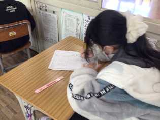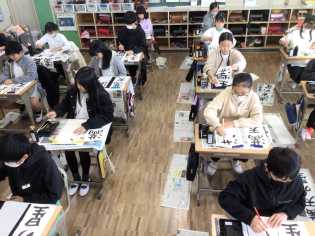 書写の授業では、校内書き初め大会に向けて、年内最後の練習をしました。6年生は、「満天の星」です。手本をよく見て、文字の形、中心を意識して、作品として仕上げています。