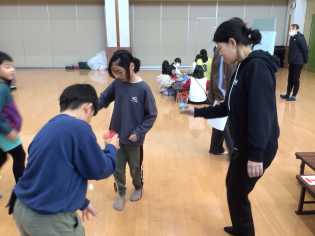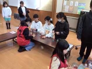 11月中旬から集めていたふたつきペットボトル、牛乳パックを使って、「ぴょんぴょんかえる」、「けん玉」、「プカプカラッコ」の3つのコーナーがあります。SDGsを意識して、集めたリサイクル品を使っています。また、今日は、1年生と6年生、明日は、2年生と5年生、明後日は、3年生と4年生の3日間を設定し、異学年が関わるきっかけにもなっています。