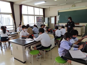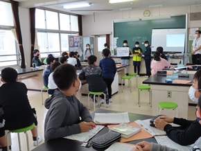 | 4月19日(火) 今日の6限の5年生の様子です。総合的な学習で、SDGsについて学んでいます。「あいさつ隊(5-1教室)」、「資源隊(5-2教室)」、「募金隊(理科室)」の3つのグループに分かれて、活動目標や当番、活動内容などについて話し合ったり、タブレットを利用して調べたりしていました。これからさらに充実した活動になることを期待しています。 |