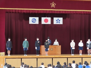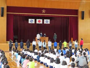 | 4月28日(木) おはよう集会の様子です。偶数学年は体育館で、奇数学年は教室(リモート)で参加しました。集会では前期の児童会役員、各委員会の委員長・副委員長、学級委員の任命が行われました。集会が終わった後、校長先生が任命された代表児童たちに向けて、励ましと期待の声をかけられていました。リーダーとなる人たちと、それを支える三吉っ子の皆さんで、これからも三吉小学校をグレードアップさせていきましょう。 |