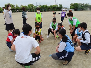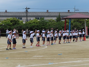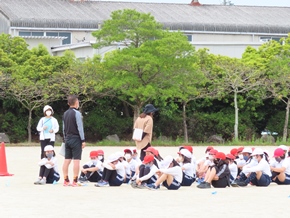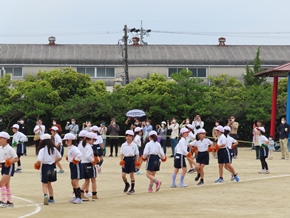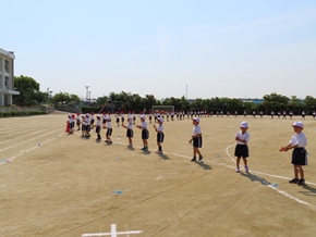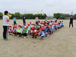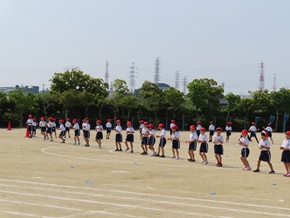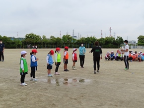 | 5月13日(金) 学年代表リレーの練習は、なかよしタイムに行っています。今日はグランドの状態があまりよくないため、走る練習は行わず、コースの位置や入退場の流れなどの確認をしました。 |