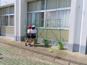 | 5月25日(水) 緑のカーテン設置を4年生が担当しています。市からいただいた苗だけでなく、この中には自分たちで育ててきた苗も含まれています。今日は例年とは違うスタイルで、南校舎前に第1回目の設置を終えました。これからどんなカーテンに仕上がっていくのか楽しみです。 |