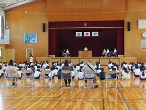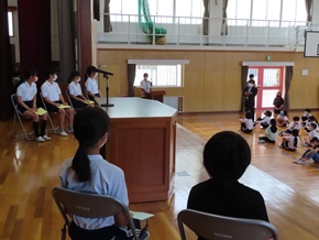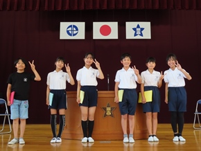 | 5月27日(金) 校内少年の主張大会が行われました。代表は、5年生から2名、6年生から4名の計6名が選ばれました。日頃から感じていること、実践していることなどを通して、周りの人へ呼びかけたいことを熱く語りました。聞いている側も、その思いを体全体で受け止めていました。 |