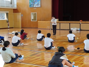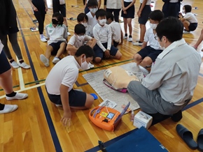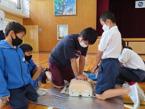 | 5月31日(火) 学校保健委員会で心肺蘇生法講習会が行われました。尾三消防署の消防士さんを講師に迎え、6年生が実習に取り組みました。周りの人の命を救うための応急処置や配慮することなどを学ぶことができました。 |