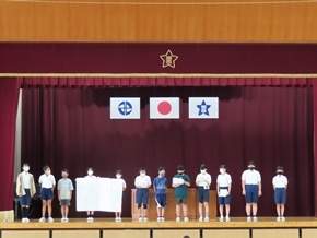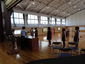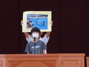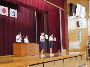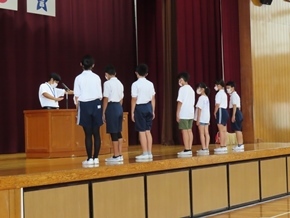 | 7月7日(木) 今日のおはよう集会の様子です。サッカー・バスケットボール部の交流試合の表彰と春休みの課題の表彰がありました。また広報・福祉委員会から、先日取り組んだ募金活動の成果と、今後の活動についてのお知らせがありました。 |