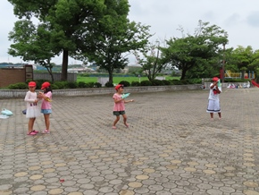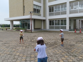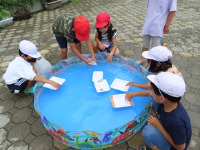 | 7月7日(木) 1年生が生活科「水遊び」の授業を行っていました。それぞれお家から持ってきたものを水に浮かべたり、道具を使って水を出したりして、意欲的に取り組んでいました。 |