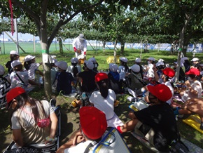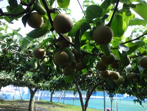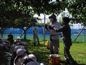 | 7月13日(水) 3年生が校外学習で、地域の梨畑に出かけました。今日は、収穫時に傷をつけないように切るための特別のはさみを見せていただいたり、肥料の秘密を教えていただいたりしました。また、特別な車で消毒をする様子も見せていただきました。梨の育て方について、より深く分かりやすく学ぶことができました。 |