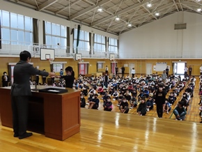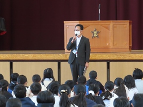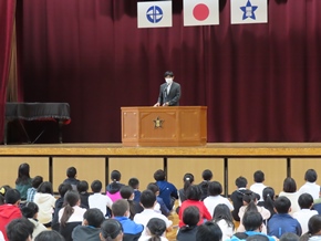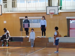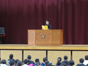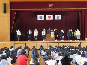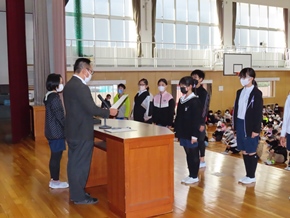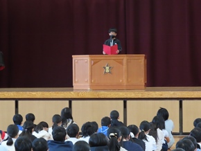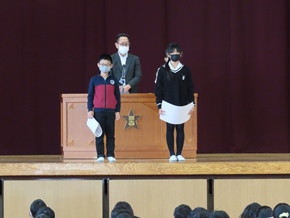 | 10月27日(木)① 今日のおはよう集会では、後期児童会役員、委員長、副委員長、学級委員の任命式が行われました。その中で、後期児童会役員の自己紹介、前期児童会児童会役員のあいさつ、表彰がありました。後期の生活も、みんなで充実させていきましょう。 |