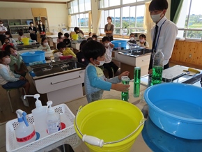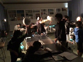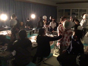 | 10月19日(水) 6年生の理科の学習の様子です。月の満ち欠けを学ぶために、ライトから出る光を「太陽」、ボールを「月」、そして自分自身を「地球」と設定して実験を行いました。実際に、光と影でボールが満ち欠けすると、「おー!」という歓声があがっていました。 |