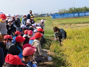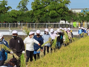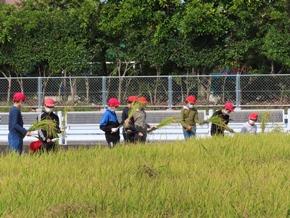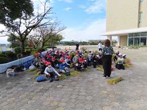 | 10月12日(水) 5年生の稲刈りの様子です。鎌の扱い方に注意を払いながら、一人ずつ稲を刈りました。刈り取った後は、それぞれ縛って干し、作業した後の掃除や片付けまでしっかりと行いました。 |