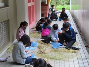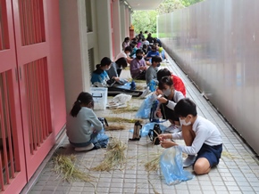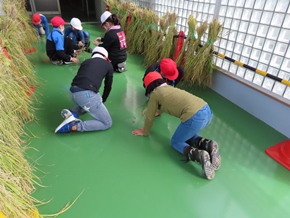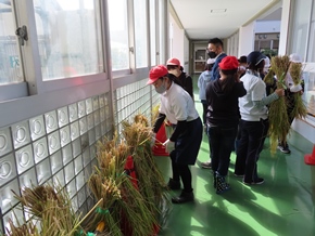 | 10月17日(月) 2・3時間目の5年2組の総合的な学習の時間の様子です。先日稲刈りをして、干してあった稲を脱穀し、籾すりを行っていました。体験を通して、作業の苦労を感じ取ることができました。 |
