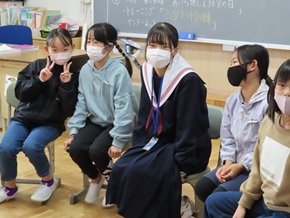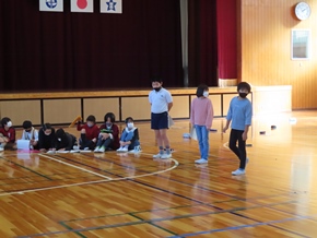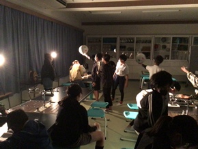 | 10月28日(金) 1時間目の4年生学芸会練習の様子です。体育館を暗くし、より当日の会場に近づけた中での練習に取り組んでいました。また、職場体験学習が最終日となる中学生の生徒さんと記念写真を撮りました。 |
