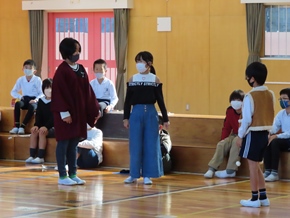 | 10月19日(水) 5時間目の4年生の学芸会練習の様子です。それぞれの役割のセリフや動き、登場のタイミングなどを念入りに行っていました。 |