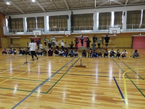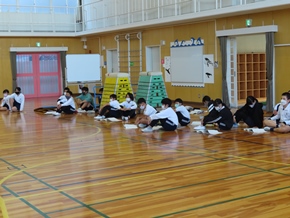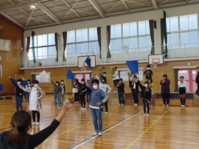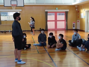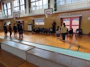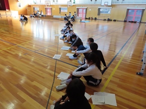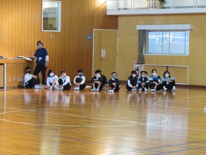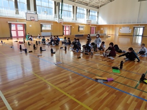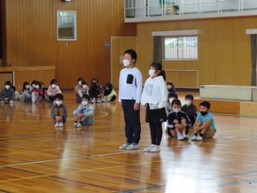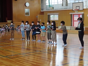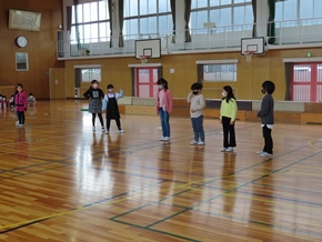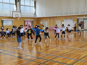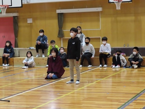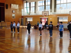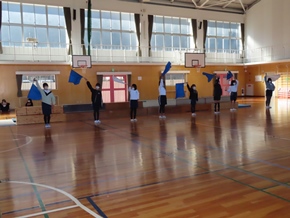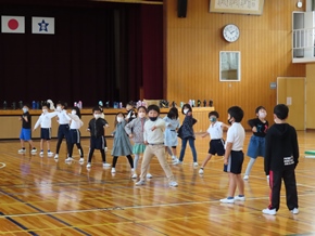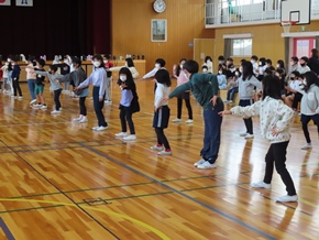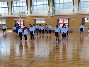 | 10月26日(水)① 1年生とバトン部の学芸会練習の様子です。1時間目は、1年生が体育館と教室の2か所に分かれて、練習に取り組んでいました。なかよしタイムはバトン部が集まり、音楽に合わせた演技を練習していました。 |