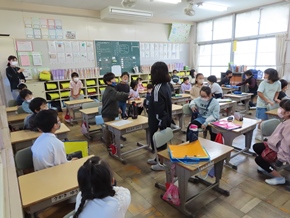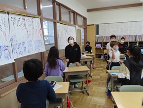 | 10月14日(金) 今日は、後期教育実習の最終日でした。1年1組、5年1組のそれぞれの児童たちが考えたお別れレクを楽しみました。実習生からもプレゼントやお別れコメントが用意されていました。3週間という短い期間でしたが、共に過ごした時間は、お互い大切な宝物になったようです。 |