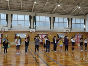 | 10月31日(月) 6時間目の金管・バトン部の合同練習の様子です。学芸会で披露する演奏と演技を合わせて行いました。しっかりと時間をかけて合わせ練習に取り組めたのは、今日が初めてでした。 |