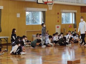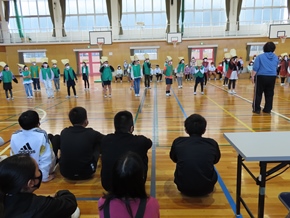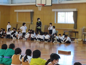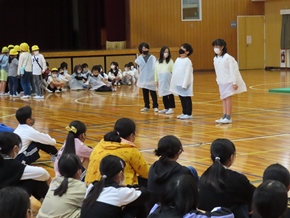 | 11月4日(金) 1時間目に、2年生が6年生に学芸会の演技を披露しました。ダンスの場面では、自然に手拍子がわき上がり、6年生が2年生を応援している光景が見られました。 |