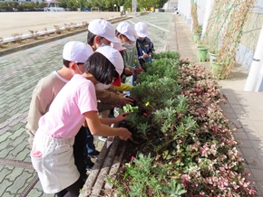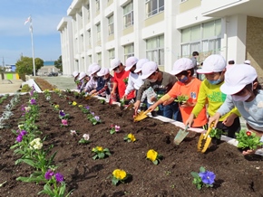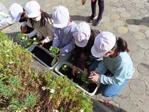 | 11月22日(火) 今日は3年2組が花いっぱい活動の一環として、花壇やプランターの花植えに取り組みました。植える場所をきちんと確認しながら穴を掘ったり、花の根元に愛おしそうに水やりを行ったりと、素敵な光景が見られました。 |
