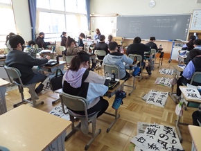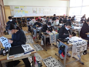| 1月11日(水) 1・2時間目に、校内書き初め大会が行われました。どの教室も、お手本をよく見ながら集中して取り組んでいる様子が見られました。 |