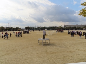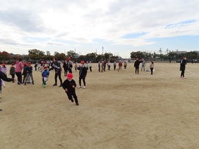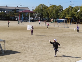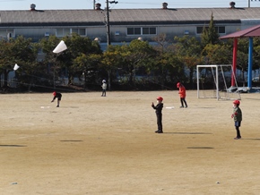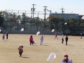 | 1月20日(金) 3時間目の1年生の様子です。楽しそうに自作した凧を上げていました。少しでも高く飛ぶように走ったり、糸の操り方を工夫したりする姿が見られました。 |