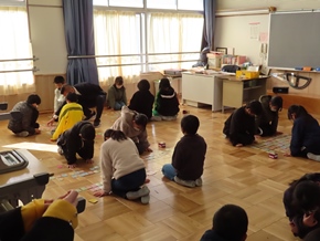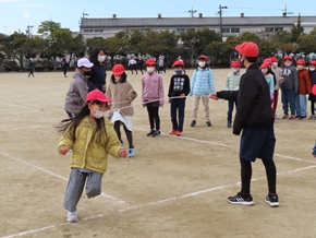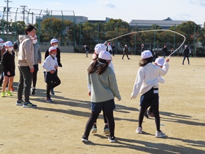 | 1月16日(月) 6年2組と1年1組で「みよし市いいじゃんスポーツチャレンジ」の長縄跳びの交流会を行いました。6年生は1年生に上手く跳ぶコツをやさしく教えることができました。1年生は6年生のアドバイスを聞いて、楽しく練習ができました。最後には、20回だった1年生の記録が28回まで増えました。 |