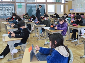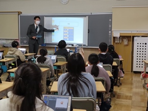 | 1月27日(金) 愛知教育大学の先生に来ていただき、5年生がプログラミング学習に取り組みました。ピョンキーというアプリを使って、低学年の子が楽しく遊べるゲーム作りをしました。完成した自分のゲームに苦戦したり、満足したりする姿が見られました。 |