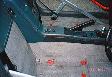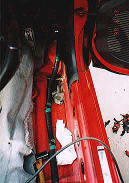 画像左は、助手席を取り外し、内装を外してカーペット下の