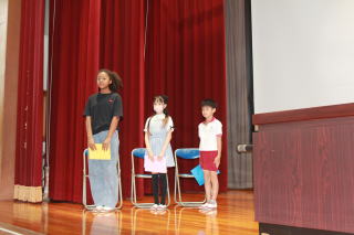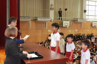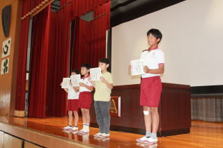 10月10日(金) 前期終業式 前期の最終日となりました。今日の1時間目に、前期終業式がありました。まず、前期を振り返って、2,4,6年生の代表児童が発表してくれました。前期頑張ったこと、後期に生かしていきたいことなどを発表してくれました。校長先生のお話では、海外の日本人学校勤務の経験をお話しいただきました。その後、表彰の伝達と士別市派遣団の研究報告がありました。前期最後の集会は、静かに集まり、落ち着いて話を聞くことができました。 |