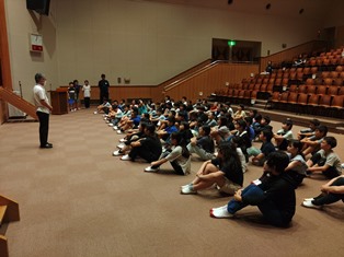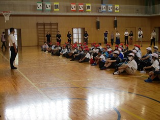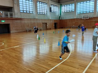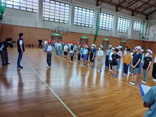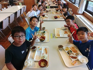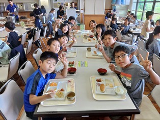 | ウオークラリーの疲れも感じさせず、スポーツレクで体を動かしました。いよいよ楽しみにしていた夕食です。 |