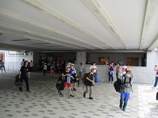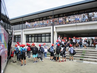 | 昨日までの雨も上がり、5年生が野外学習に出かけました。たくさんの子どもと保護者で見送りました。 |