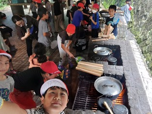 | 野外学習2日目。全員元気に過ごしています。朝食を食べて、これから野外炊飯を行います。 |