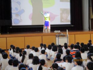 | 全校でおはよう集会を行いました。イメージキャラクターの「ざさっこぱんだ」も登場し、前期の振り返りについて考える機会になりました。 | |||
