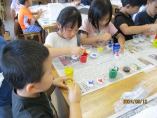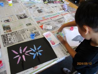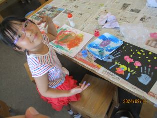 | 2年生の図工では、「とろとろえのぐ」を使いました。手を使って感覚的に描き、素敵な作品を作り上げました。 | |||
