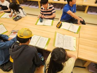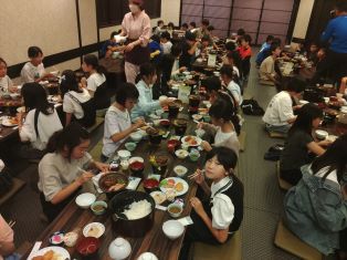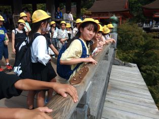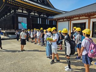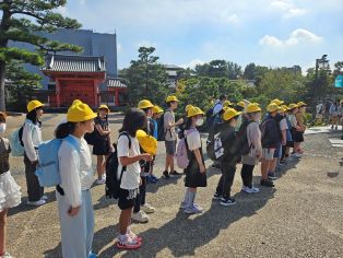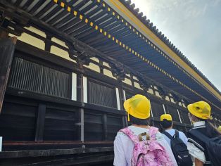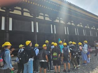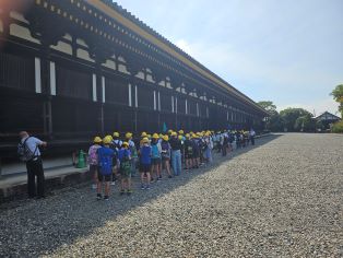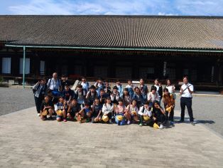 | 第1日目。全員そろって元気に出発しました。訪問先では熱心に説明を聞いています。京都の歴史ある建物に興味津々です。 |