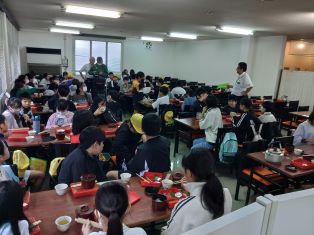 | 昼食です。カレーが別の器で出て、ご飯にかける子、別々で食べる子に分かれました。 |