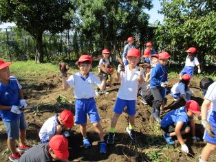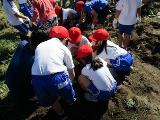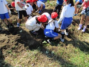 | 2年生が畑で育てたいもを収穫しました。深くまで穴を掘って大きないもをとることができました。 |
