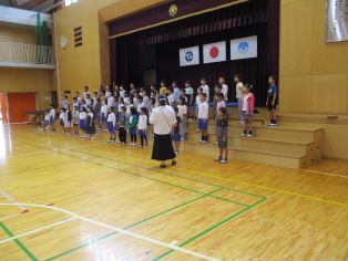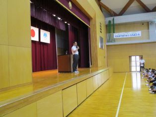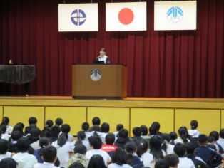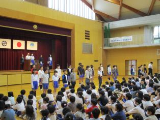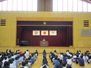 | 前期の終業式を行いました。前期の振り返りと後期の抱負を6年生の代表児童が堂々と発表しました。 |