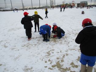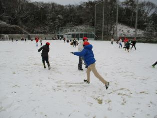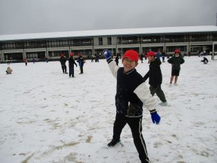 | 運動場に積もった雪に、大喜びの子どもたち。一時間目に、一斉に雪遊びをしました。雪を集めて大きな雪だるまをつくったり、雪玉を投げたりして大いに楽しみました。 |