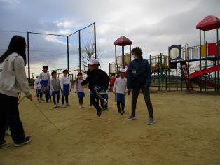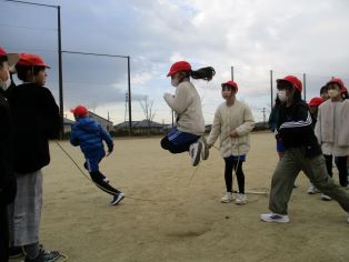 | 大なわとび大会を行いました。各クラスから回数を数える大きな声が聞こえてきました。 |