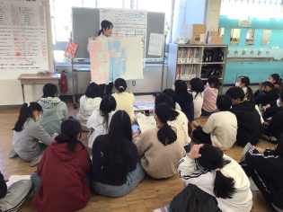 理科「土地のつくりと変化」の学習では、講師の先生をお招きして学びました。1500万年前には、この辺りまで、瀬戸内海から海がつながっていたことを知り、驚いていました。また、礫、砂、泥や化石などを実際に触ったり、標本づくりにも取り組んだりしました。 |
