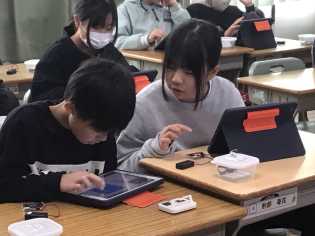 6年生の教室では、プログラミング学習として「micro:bit」に取り組んでしました。プログラムした通りにLEDが光るので、どのように光らせようかと真剣に考えていました。 |