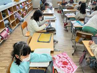 教室では、図工の授業で鑑賞会をしていました。 自分の作品と作品づくりで、がんばったところをタブレット上で全員で共有するなどICT機器を使用していなかった時代からすると夢のような鑑賞会になっていました。