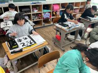 初めて筆を握ってから、はや1年が過ぎようとしています。今日は、「書で遊ぼう」と題して、思い思いの字を書きました。お手本がないので、失敗はないはずなのですが、「失敗しちゃった・・・」と落ち込む子もいましたが、それぞれの個性あふれる作品が出来上がりました。