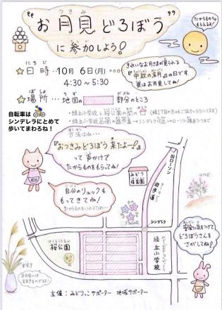 みどりっこサポーター主催での開催も今年で4年目となり、約120名ほどの 子どもたちが 玄関先に飾ってあるお菓子やススキ、松ぼっくり、お団子などを集めて楽しみました。